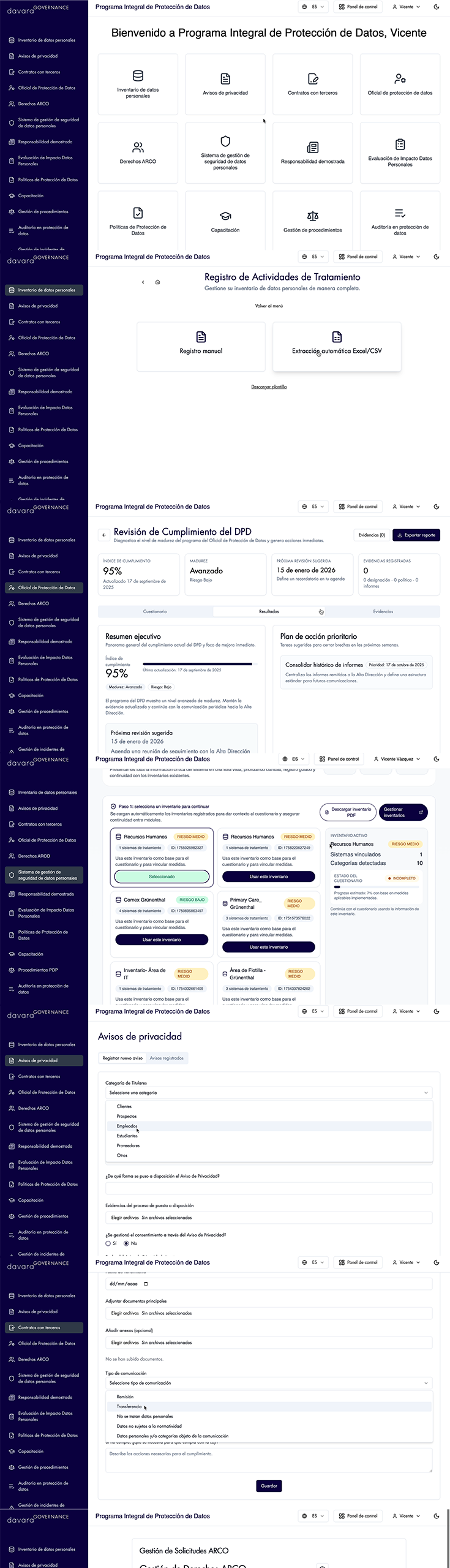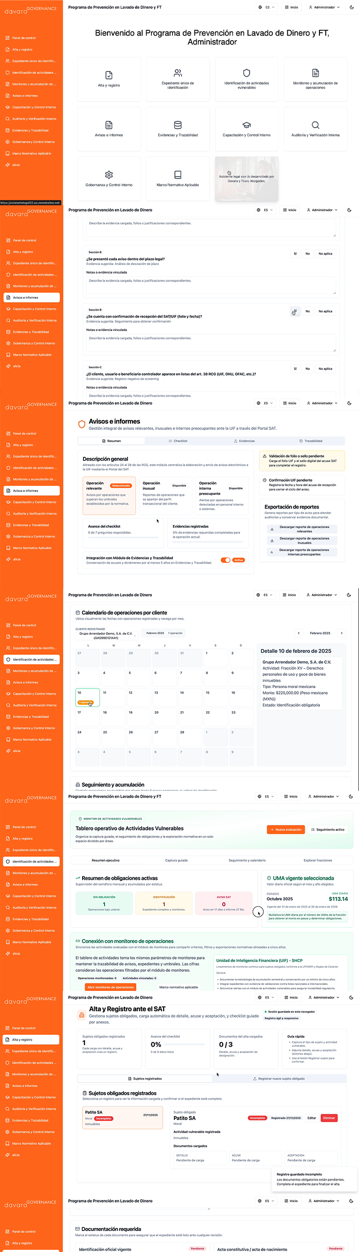 Davara Abogados ha desarrollado, bajo el sello Davara Governance, una suite de plataformas para facilitar la gobernanza, gestión, implementación y evidencia del cumplimiento normativo en protección de datos personales (con módulos especialmente detallados en ciberseguridad, y diligencia de proveedores), en gobernanza de sistemas de inteligencia artificial (IA) y en prevención de lavado de dinero (PLD).